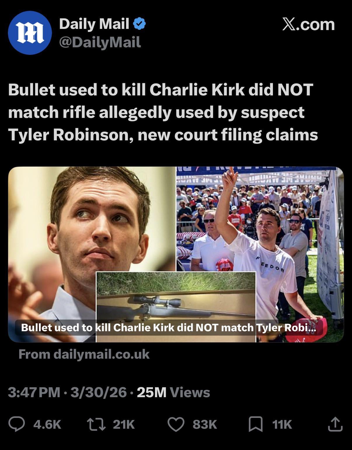 Odd-Significance9661 on March 31, 2026 11:56 pm This case just keeps getting weirder & weirder… https://people.com/bullet-killed-charlie-kirk-doesnt-match-tyler-robinson-rifle-lawyers-claim-11938079