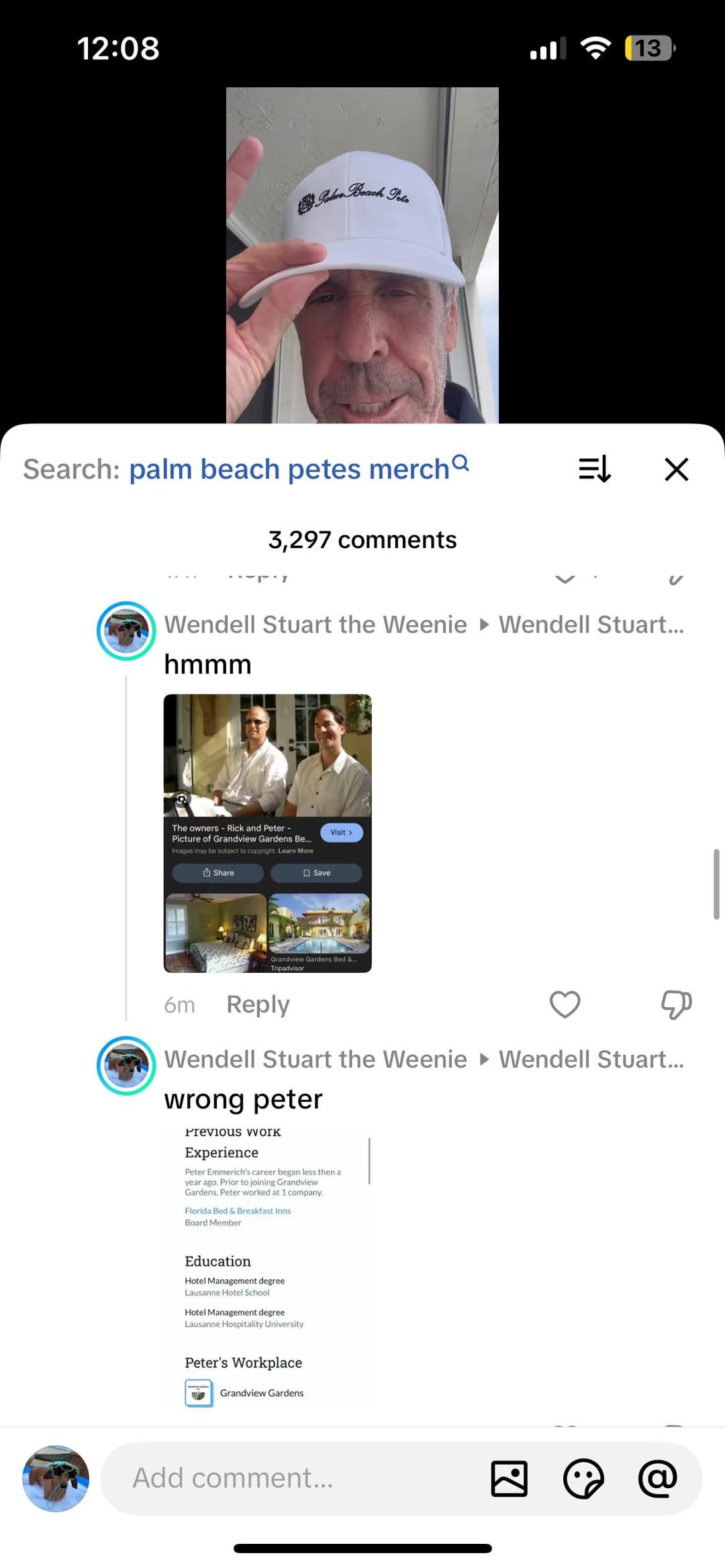 so i came across this comment on pete’s tiktok. at first glance i thought, seems legit. but the last part stuck out to me bc i had actually been to that bed and breakfast around the time that he was supposedly running it and i distinctly remember the men running it bc my mom loved them. i’m thinking what are the odds palm beach pete was one of them, so i do i little digging and pretty easily find a photo of the two owners who i remember, one is named peter and it’s obviously not palm beach pete. do a search on that guy and his background is the background listed in the comment for palm beach pete. so there could be a very innocent explanation, the original commenter just got the names mixed up and just accidentally reported false info. but it’s the fact they said they said they did a “research deep dive” that kind of makes me think….is it possible that *whoever the forces may be* are giving “palm beach pete” a fake background and giving him other peoples credentials online and faking them as his own to make it more believable that he has a history before jeffrey epsteins “death”? thoughts? i know this is controversial, i haven’t done any crazy deep dives this is just the one piece of info that i came across. (and i accidentally did my comments on my dachshunds tiktok page😭)