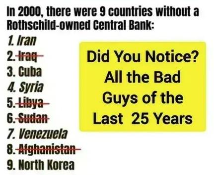 See, without a Rothschild bank, a country’s leaders become crazy and power hungry. That’s why they need to be taken out. A Rothschild bank instills democracy and order.