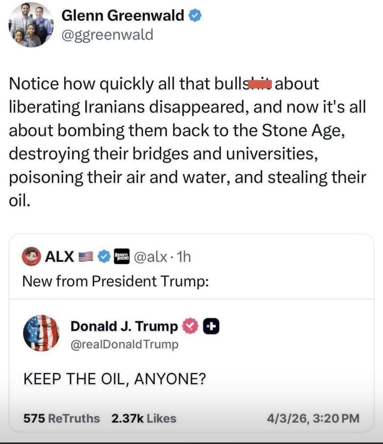 everydaycarrie on April 5, 2026 4:33 am trump, proving to the entire world that he is a liar and a thief.