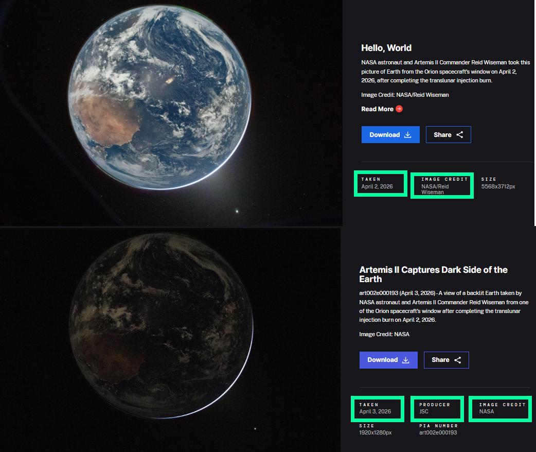Looking for informed explanations on why these two NASA images, reportedly taken a day apart, show nearly identical cloud patterns and inconsistent credits. Curious if this is due to imaging timing, processing methods, or something else I’m missing. Both available on NASA website [https://www.nasa.gov/gallery/journey-to-the-moon/](https://www.nasa.gov/gallery/journey-to-the-moon/)