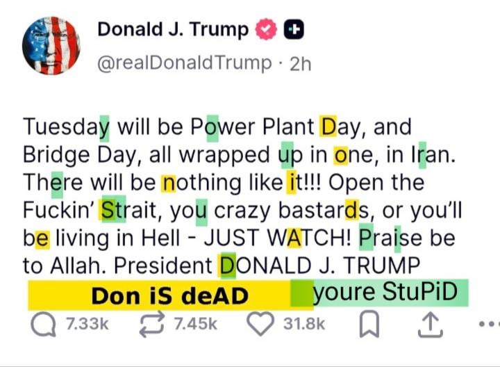 Odd_Dragonfly_1834 on April 5, 2026 5:26 pm You think the Russians and Iranians made him use Allah in order to get some kind of deal?