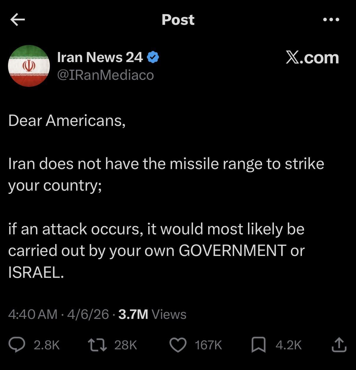 00lalilulelo on April 7, 2026 10:06 am Based on track record and past behaviors of all parties involved, I’d be inclined to believe this statement from Iran. Disclaimer: I’m not living in the U.S.