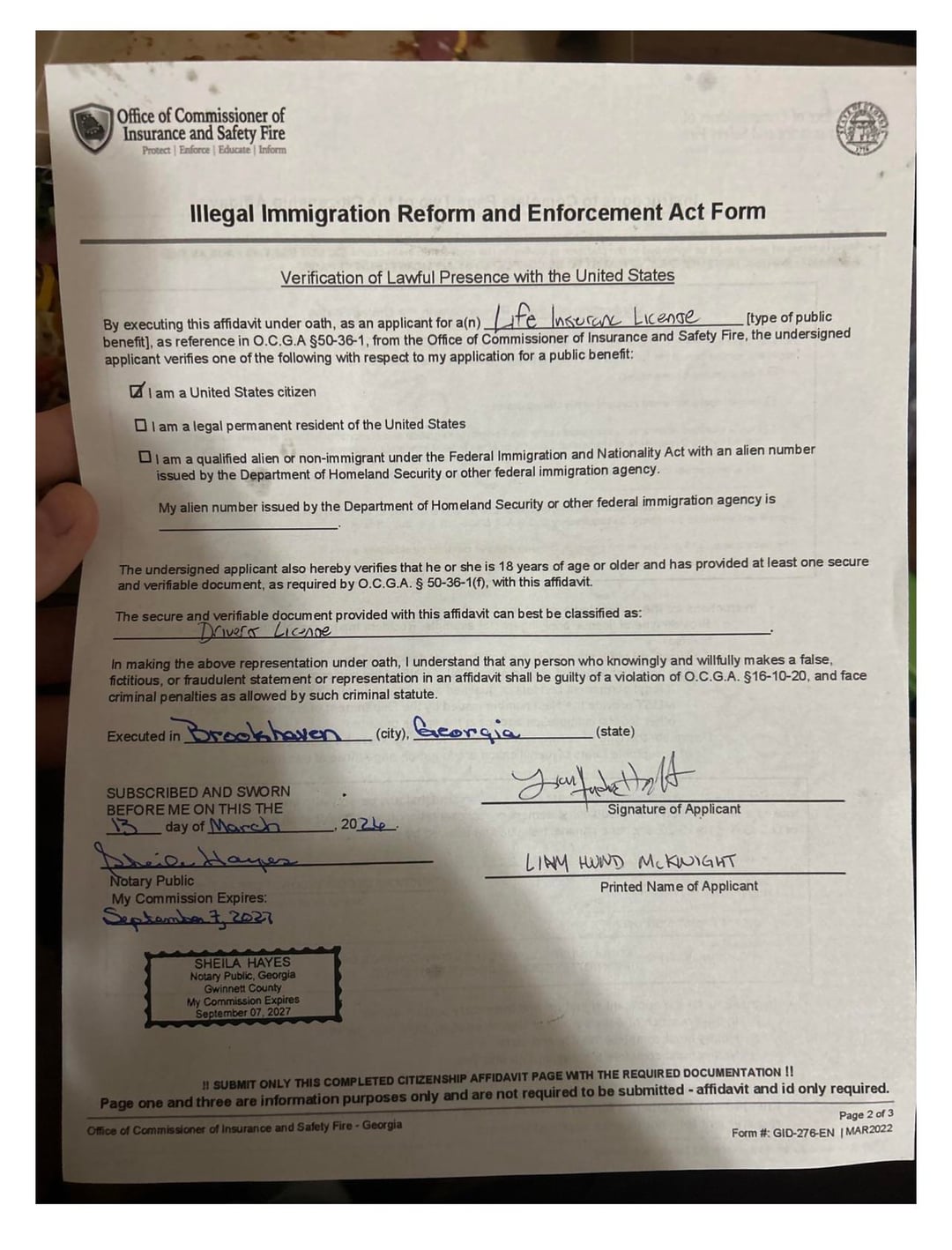 Georgia forces every driver to carry mandatory liability insurance (O.C.G.A. § 40-6-10), yet the state lets people with a federal alien number (qualified aliens/non-immigrants) get a life insurance producer license by simply checking a box and providing their alien number—no full in-person verification required like for driver’s licenses.