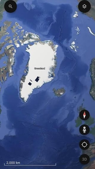 its just a glitch or a misplaced photo you need to calm down. greenland is mostly white so it is hard for the software to stitch the photos correctly becouse it does not have points of reference