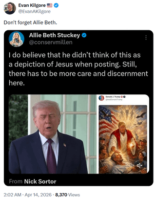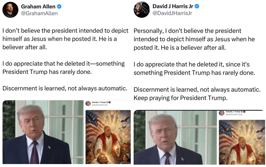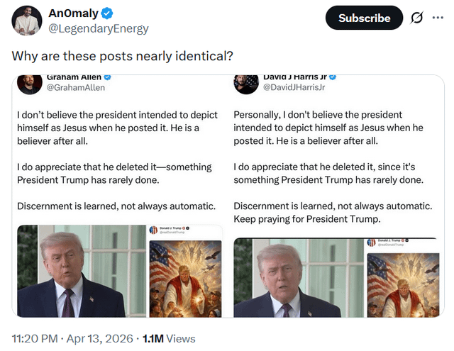 SS: Are these Trump supporters who have a lot of followers being paid to say the same thing? Embarrassing. Remember also when Trump posted an image of himself as pope? [Link](https://x.com/RealCandaceO/status/2043827375398375871) to original tweet.