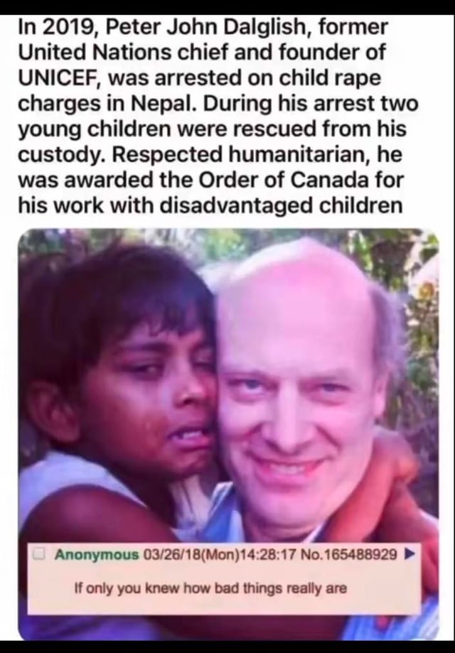 Peter John Dalglish, former UN Chief & Founder of UNICEF, was arrested on child rape charges in Nepal. Two young children were rescued from his custody. He was awarded the Order of Canada for his work with disadvantaged children…
