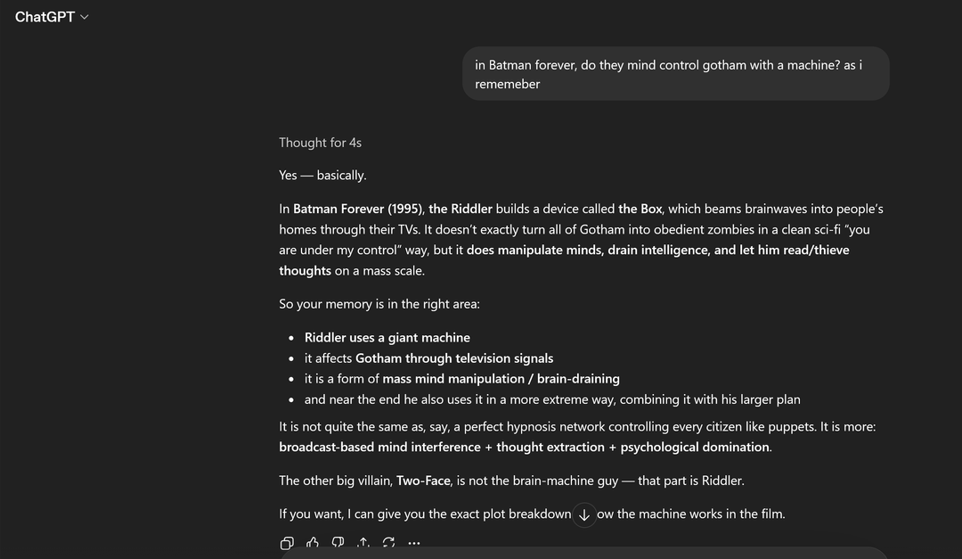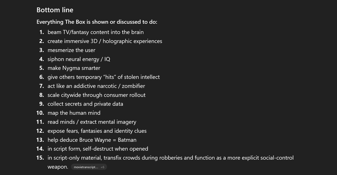 The Box is not just “TV mind control.” In Batman Forever it is a brainwave interface / immersive-hologram device / neural siphon / mind-mapper. It is shown or stated to do a lot more than one thing. The closest accurate summary is: it beams TV/fantasy content into the brain, mesmerizes the viewer, siphons neural energy/IQ, can scale that theft citywide, and later evolves into a machine that can map minds and expose secrets.