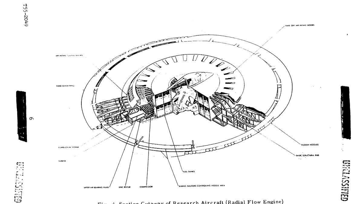 The aircraft, which allegedy had VTOL (vertical take off and landing) capabilities, utilized an ingenious system to reduce the boundary layer (the air that accumulates in front of an aircraft in flight). The dead air was sucked through intakes around the circumference of the circular wing and expelled through adjustable radial nozzles which could allow for incredible maneuverability. The pilot would have been situated in a cupola-shaped cockpit at the center of the craft. The flying saucer was born…