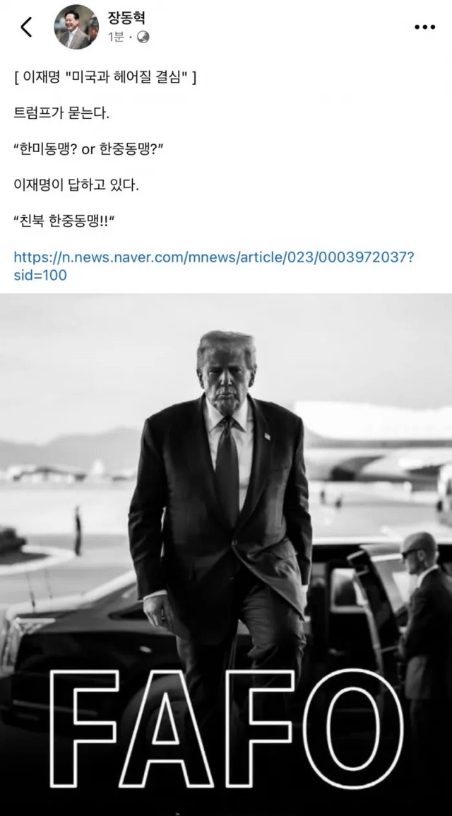 Jang set up a hypothetical conversation between U.S. President Donald Trump and President Lee, writing, “Trump asks: ‘Korea–U.S. alliance? Or Korea–China alliance?’ Lee Jae-myung answers: ‘A pro-North Korea Korea–China alliance!’”