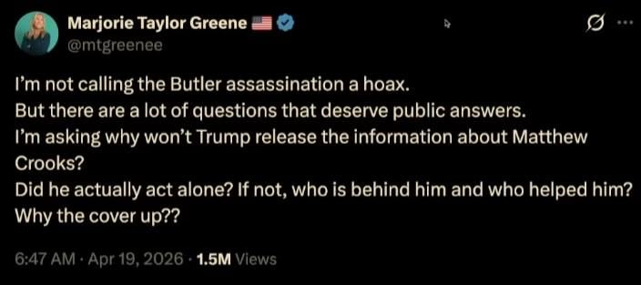 ItalianSausage2023 on April 21, 2026 9:49 am [https://www.independent.co.uk/news/world/americas/us-politics/marjorie-taylor-green-trump-assassination-theory-b2960695.html](https://www.independent.co.uk/news/world/americas/us-politics/marjorie-taylor-green-trump-assassination-theory-b2960695.html) [https://thehill.com/homenews/administration/5834365-greene-trump-feud-rhetoric-death-threats/](https://thehill.com/homenews/administration/5834365-greene-trump-feud-rhetoric-death-threats/)