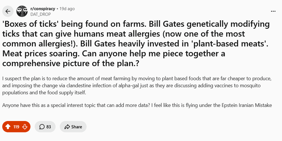 Of COURSE it was a silly weekend conspiracy sh*tpost about Bill Gates dropping boxes of genetically modified ‘meat allergy’ ticks carrying alpha gal on random farms…. until this bot’s arrival 20 days later.
