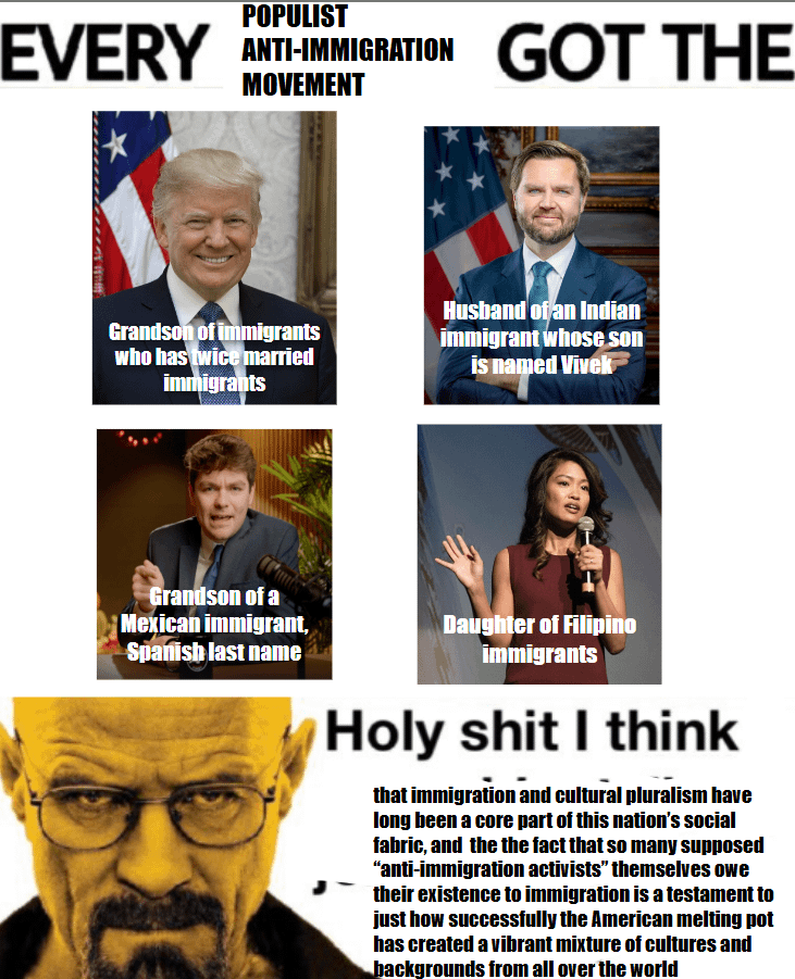 vi_sucks on April 29, 2026 9:01 pm That was *always* true though. American nativism has always been about immigrants and the descendants of immigrants trying to shut the door on the next wave.