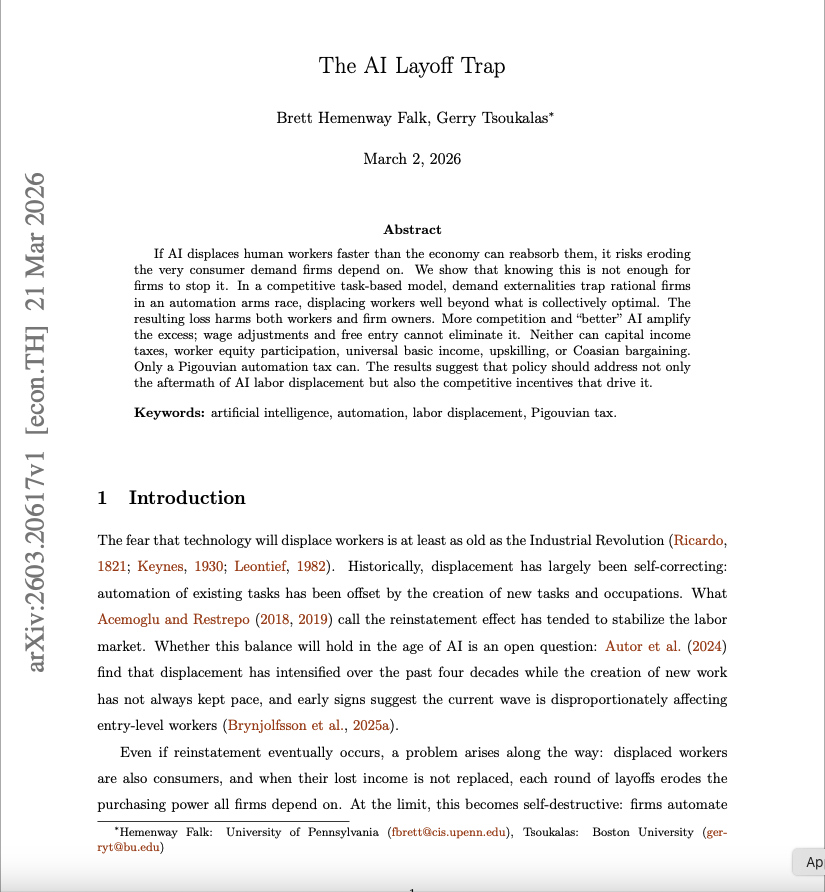 The paper is called "The AI Layoff Trap." Published March 2, 2026. Wharton School, University of Pennsylvania. Boston University. Peer reviewed. Mathematically modeled. The conclusion is one sentence: