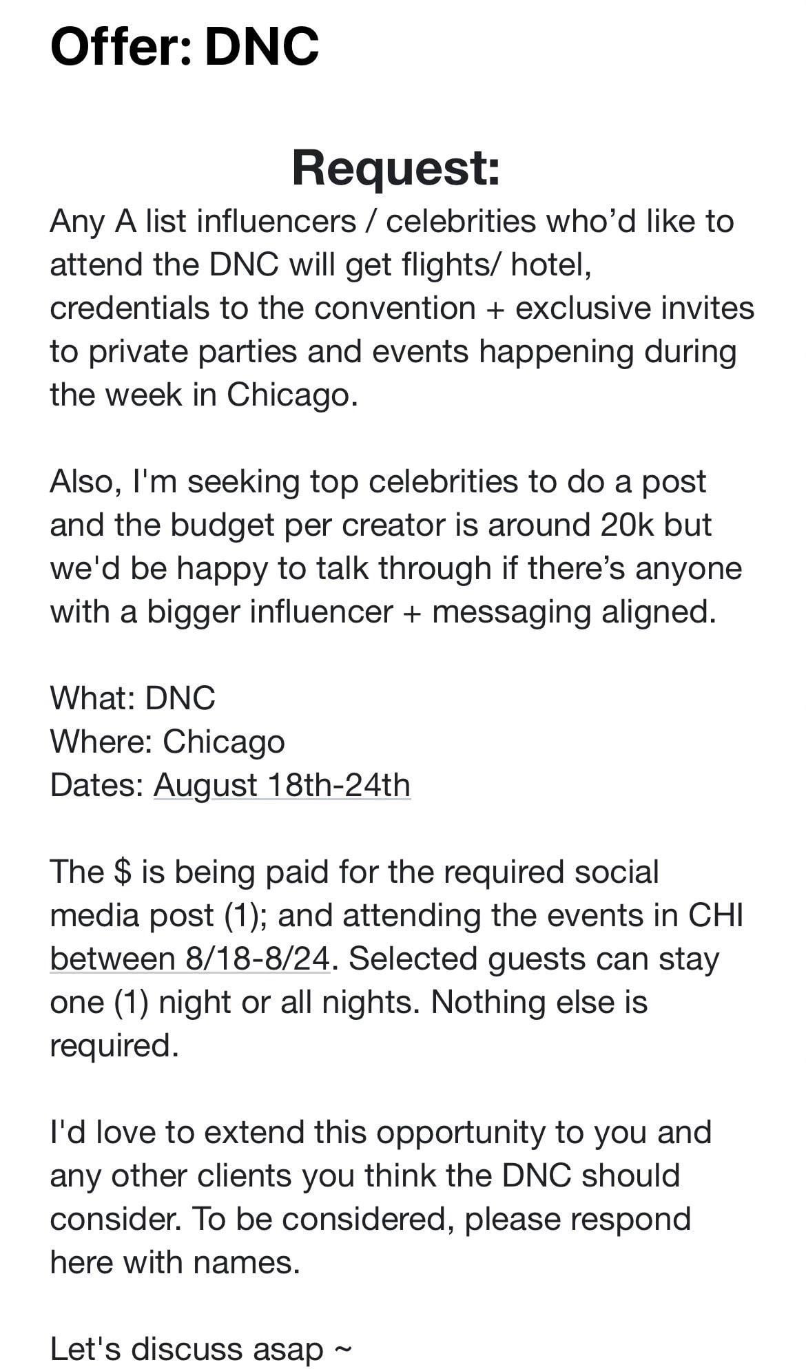 • Payment Details: Kamala Harris is reportedly offering influencers and celebrities $20,000 each to attend the DNC convention. An email from PR agents reveals this arrangement, which includes flights, hotel accommodations, convention credentials, and exclusive invites to private events.
