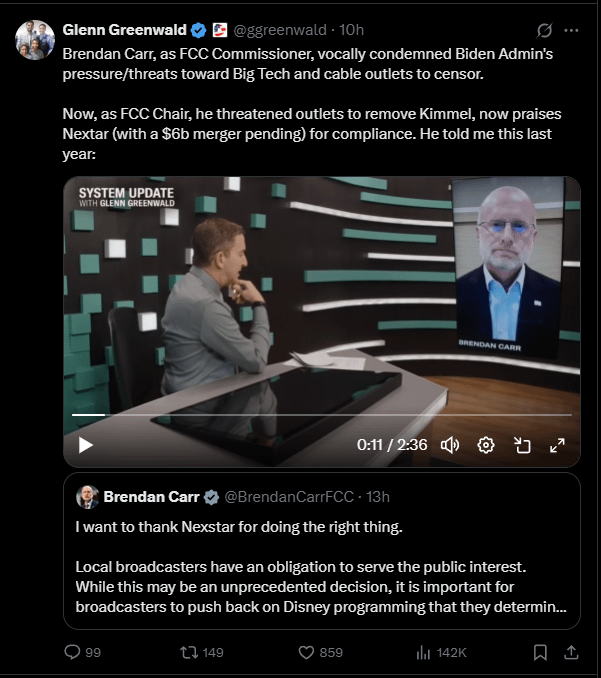 Brendan Carr, as FCC Commissioner, vocally condemned Biden Admin’s pressure/threats toward Big Tech and cable outlets to censor. Now, as FCC Chair, he threatened outlets to remove Kimmel, now praises Nextar (with a $6b merger pending) for compliance. (SS has video)