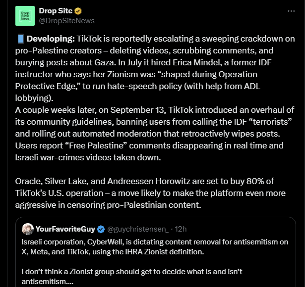> 📱Developing: TikTok is reportedly escalating a sweeping crackdown on pro-Palestine creators – deleting videos, scrubbing comments, and burying posts about Gaza. In July it hired Erica Mindel, a former IDF instructor who says her Zionism was “shaped during Operation Protective Edge,” to run hate-speech policy (with help from ADL lobbying).